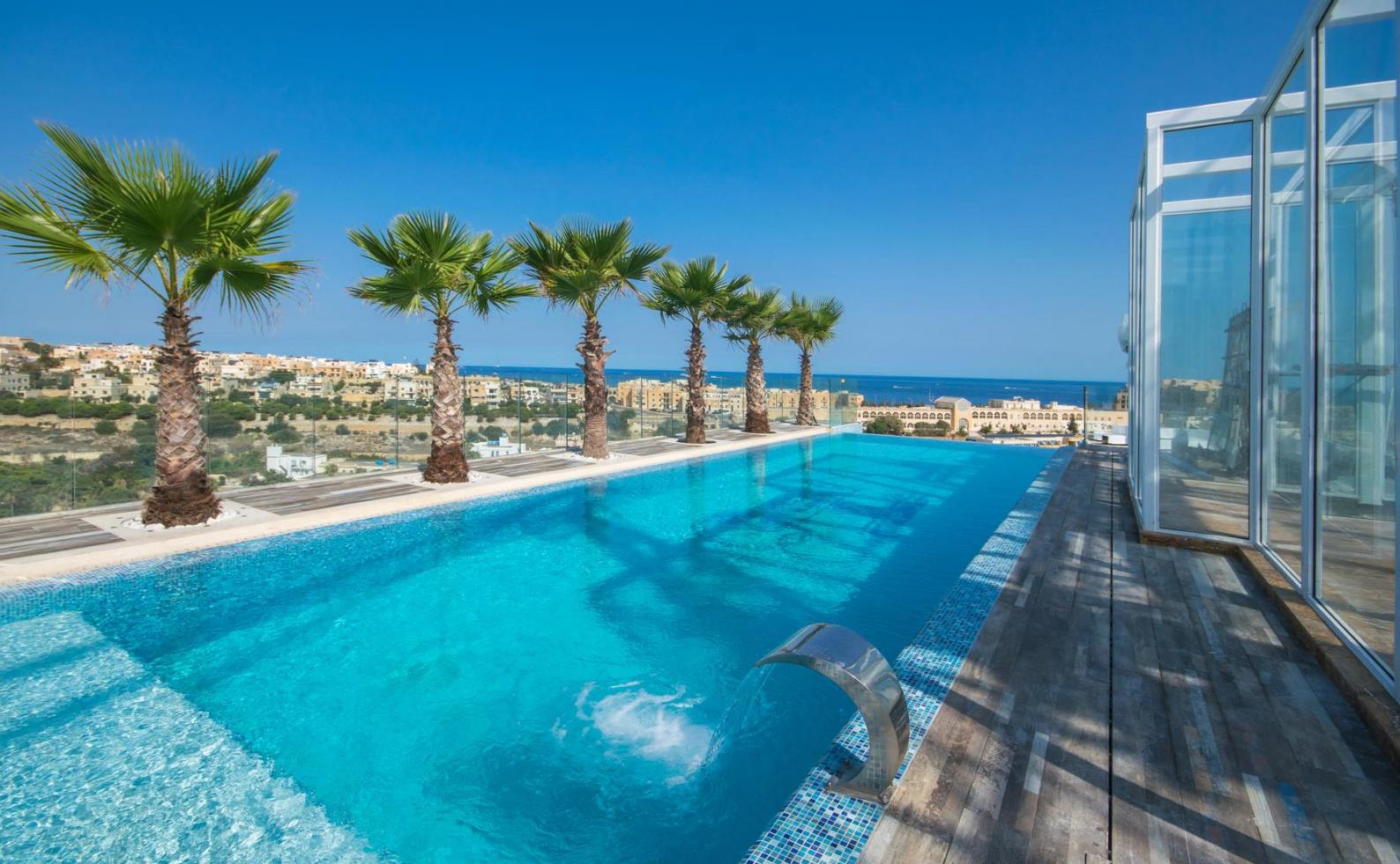 Plážový hotel v 2. řadě Hugos Boutique Hotel, oblíbený zvláště u novomanželů na svatební cestě, leží v San Giljan (St Julian) asi 50 m od volně přístupné písečné pláže "St George". Na pláži jsou k dispozici lehátka (zdarma). Do turistického centra se dostanete pouze po pár metrech. Město Luqa Airport je vzdáleno asi 11 km (Sliema asi 4 km, Birgu asi 12 km). Nejrůznější nákupní možnosti a také supermarket najdete přímo u hotelu. Do nejbližších barů a restaurací se dostanete za pár minut. Přímo u hotelu najdete diskotéku. Další možnosti zábavy Vám během Vašeho pobytu nabízí blízké kino. Z hotelu se můžete dostat k následujícím turistickým zajímavostem: Mediteraneo (cca 4 km) a Valletta (cca 10 km). O Vaši mobilitu se během dovolené postarají půjčovna aut a motocyklů, stanoviště taxi (přímo u hotelu) a také blízká autobusová zastávka. Lékařskou pomoc najdete v případě potřeby v nemocnici, která se nachází ve vzdálenosti cca 4 km od hotelu. Mezi hotelem a letištěm je nabízena kyvadlová přeprava (případně za poplatek). Mezinárodní letiště Malta je od hotelu vzdáleno 11 km.
