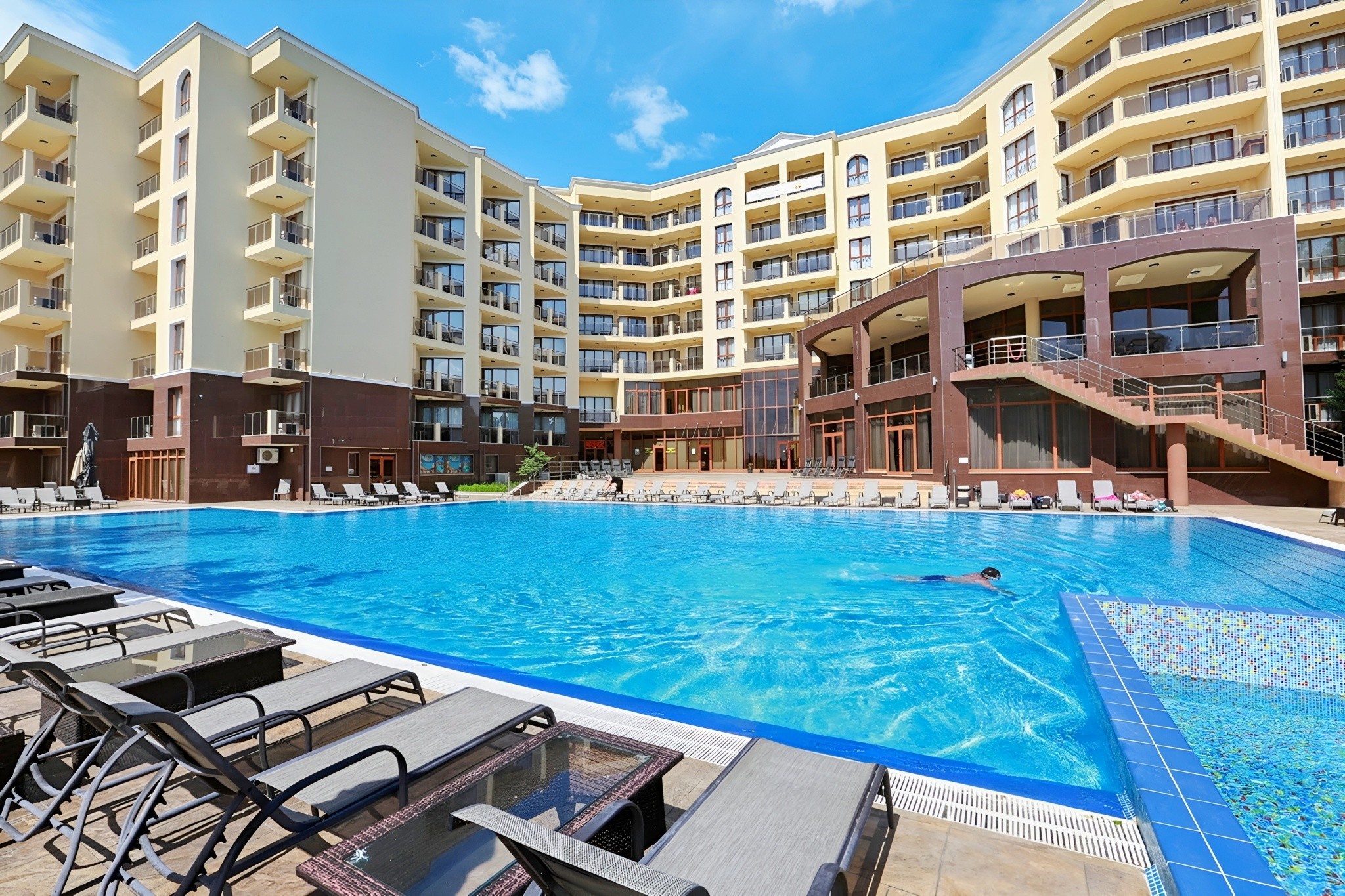 Hotel v mírném svahu v zeleni nad centrem letoviska, restaurace, obchody a bary v blízkosti. Letiště Varna 25 km.